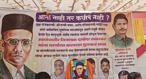 धुळे दि ३० : स्वातंत्र्यवीर विनायक दामोदर सावरकर यांना मरणोत्तर भारतरत्न पुरस्काराने सन्मानित करावे, या प्रमुख मागणीसाठी धुळे शहरात दोन दिवसीय साखळी उपोषणाला सुरुवात झाली आहे. ‘आता नाही तर कधीच नाही?’ असा नारा देत प्रेरणा बहुउद्देशीय संस्थेने हे आंदोलन पुकारले आहे. संस्थेचे अध्यक्ष सुनील भाऊ मुरलीधर देसले यांच्या नेतृत्वाखाली जेलरोड परिसरात हे उपोषण सुरू करण्यात आले असून, अनेक कार्यकर्ते यात सहभागी झाले आहेत.
